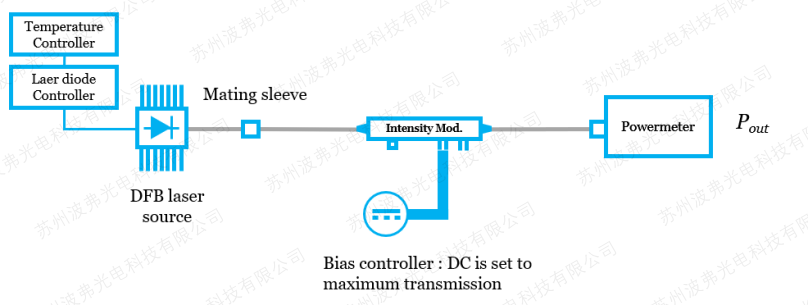 调制器的损耗是由于光纤和波导耦合,光在波导的传输过程等造成的光强衰减。对于强度调制器,需要通过调节调制器的DC偏压(Pin 1&2),以测量调制器的最大传输(输出)功率。对于相位调制器,则无需偏压控制,直接测量输入和输出功率。需要注意的是有和无光学接头(通常为FC/APC)的调制器测量方法的区别,常规产品都是带光纤接头的,所以这里我们仅仅介绍这种测量方法。无光纤接头的测量方法,请CA888亚洲城提供详细的调制器手册。 将电光调制器输入功率和输出功率之差定义为插损: