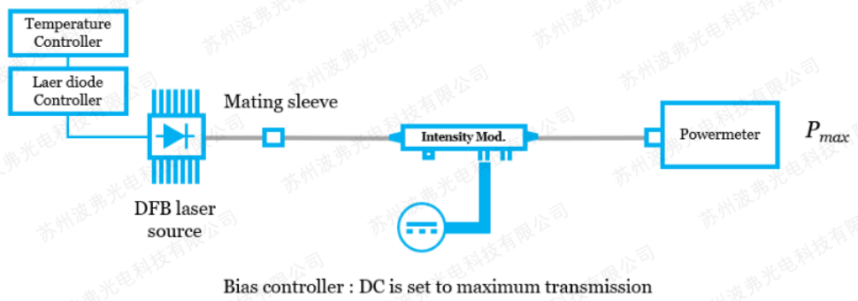 直流偏压的半波电压VπDC仅仅适用于强度调制器,而非相位调制器(无偏压接口)。VπDC是电光调制器,通过DC偏压调节,传输的光波引入一个相移所需的电压。对于强度调制器,即M-Z干涉仪,半波电压(Vπ)对应为将光输出功率从最大Pmax改变为最小Pmin时的DC偏压值,(参考调制器的传输曲线MTF),其测量方法同前面静态消光比的测量,只不过此时记录电压值的差值。