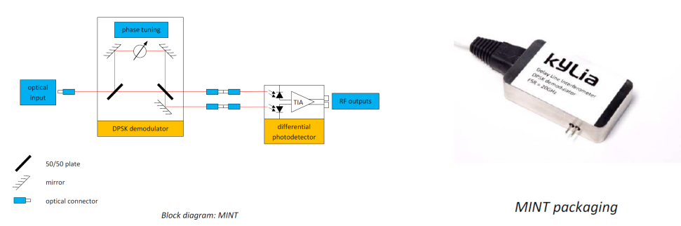 当对传输速率的需求高于Gbit/s时,必须开发新的调制和解调技术。基于自由空间设计和长期的电信技术背景,iXblue能够为这种复杂的解调提供各种产品。其中一系列产品(iXblue MICS系列,请CA888亚洲城提供更多资料)致力于多路复用和解复用,这意味着能够在一根独特的光纤中传输许多不同波长的激光(即40路不同波长的激光束在一根典型的电信光纤中传输,1528至1560 nm,C波段,)。另一系列产品(iXblue MINT系列,见下图)使用光的另一个特性进行解调,即电磁波的相位,相位(0或π)的调制比强度的调制更容易、更快。MINT产品使光学DPSK(差分相移键控)解调成为可能,它适用于大约10 Gbit/s的更高传输速率。i
