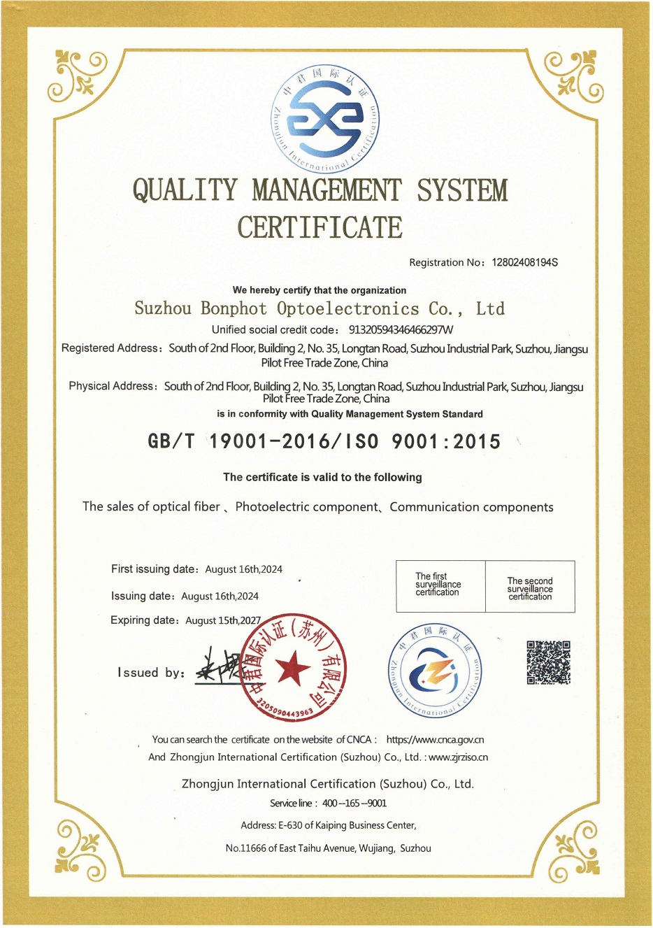 苏州CA888亚洲城光电科技有限公司通过GB/T 19001-2016/ISO 9001:2015质量管理体系认证 证书
