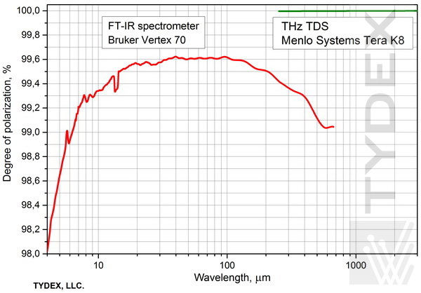 上面的曲线清楚地表明我们的偏振器在非常宽的波长范围内具有出色的质量。 请注意,实际测量结果可能与上面给出的值不同,具体取决于光谱仪类型和测量模式。