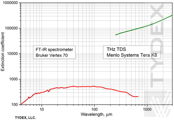 偏振器的透射光谱由两台仪器测量。 在 0.9 – 670 μm (333.1 – 0.45 THz) 的短波范围内,使用了 FT 光谱仪 Bruker VERTEX 70。 在 150 – 3000 μm (2 – 0.1 THz) 的长波范围内,我们使用了带有 600 μm 偶极天线 (fc=0.5 THz) 的 Menlo Systems TERA-K8 太赫兹时域光谱仪。