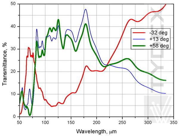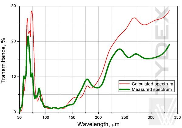1. TWPC作为半波单色板,适用于80-160μm范围内的任何波长。TWPC作为120 μm半波片进行了测试。图1显示了使用平行偏振器计算和测量的TWPC透射光谱的比较。在120 μm处几乎为零的透射率证实了在所选波长处的适当偏振转换。