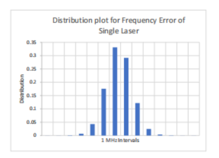l 分布图显示了1 MHz间隔上的分布。大约62%的样本在+/-1 MHz范围内;大约92%在+/-2 MHz范围内。激光器的标准偏差为1.1MHz。